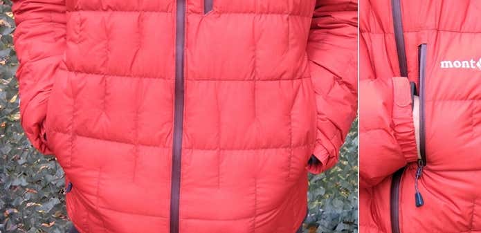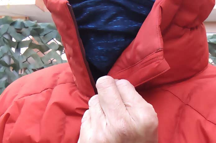 ジッパーのスライダーがあごへ当たらないためのチンガードが施され、スライダーが冷たく不快なことはありません。止水処理されているフロントジッパーの上げ下げもスムーズ。ダブルファスナーではないのでモタつくこともありません。