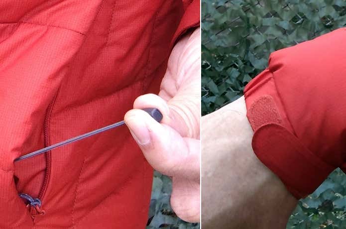 裾はポケット内側のドローコードで調整可能。袖はベルクロ止めです。