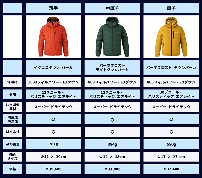 「イグニスダウン」は薄手タイプ、「パーマフロスト ライトダウン」は中厚手タイプ、「パーマフロスト ダウン」は厚手タイプです。厚手になるほど保温力が高くなりますが、重量も大幅に増加。