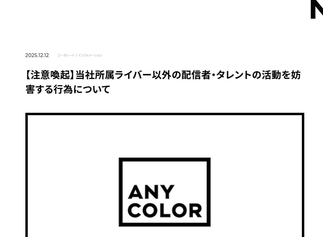 12月12日、VTuber事務所の「にじさんじ」(登録者数187万人)を運営するANYCOLOR株式会社が、公式サイトとXに声明文を掲載。所属ライバー以外の配信者やタレントの活動を妨害する一部ファンの行為について注意喚起しました。