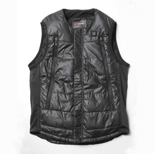 市販のモバイルバッテリーを電源とする軽量な電熱インナーベスト。両胸と背中に小型ヒーターパネルを備え、最小限の電力で効率的に防寒効果を発揮する。ボディサイドには伸縮性リブを採用し、体格を問わずフィット感を確保している。