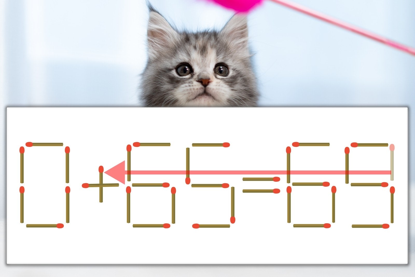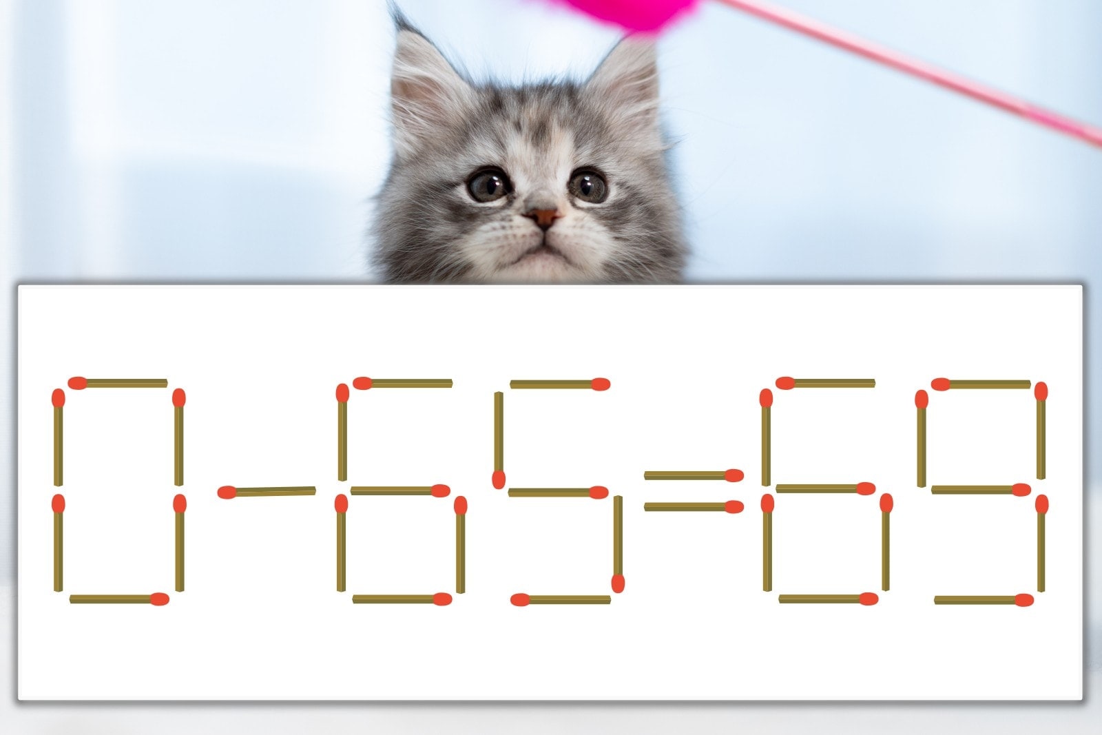 「9」を別の数字に変化させると答えが導き出せます。「9」のマッチ棒を1本移動して、「-」を「+」にしてみましょう。すると、「0+65=65」が成立します。