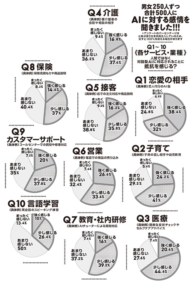 週プレでは500人にアンケートを実施し、対話型AIへの抵抗感を調査。医療、カスタマーサポート、介護など、接客や営業を伴うあらゆる業種において、対話型AIに対応されることがアリかナシかを探った。