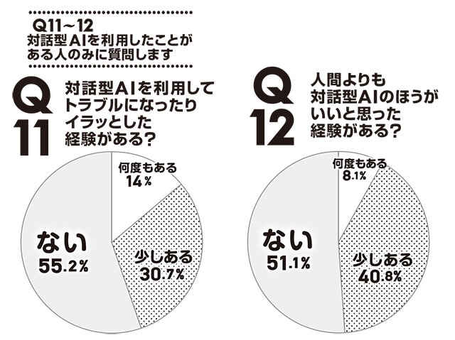 Q11では、44.7%の人が「対話型AIを利用してトラブルになったりイラッとした経験がある」と回答。利用したことがある人の半数近くが対話型AIで困った経験があるという結果に。