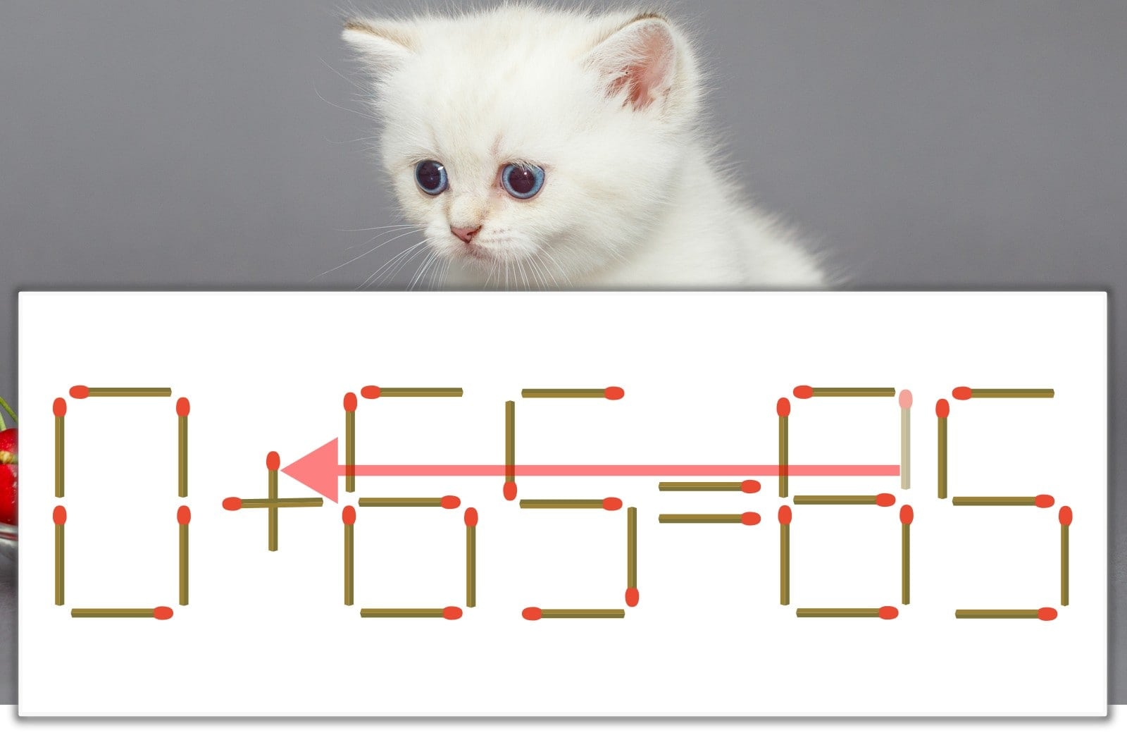 「8」を別の数字に変化させると答えが導き出せます。「8」のマッチ棒を1本移動して、「-」を「+」にしてみましょう。すると、「0+65=65」が成立します。