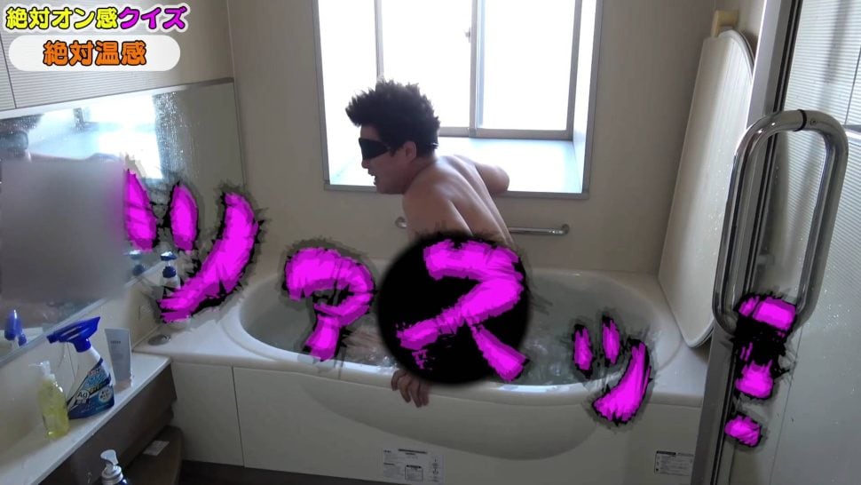 1問目は「絶対温感」を測るとして、目隠しで冷水または温水かわからない風呂に飛び込み、その瞬間に冷たいか熱いかを叫ぶという問題でした。メンバーは全裸で、局部は黒い丸で隠されていましたが、ゆめまるに関しては、壁にあった鏡に映り込んでしまっていました。