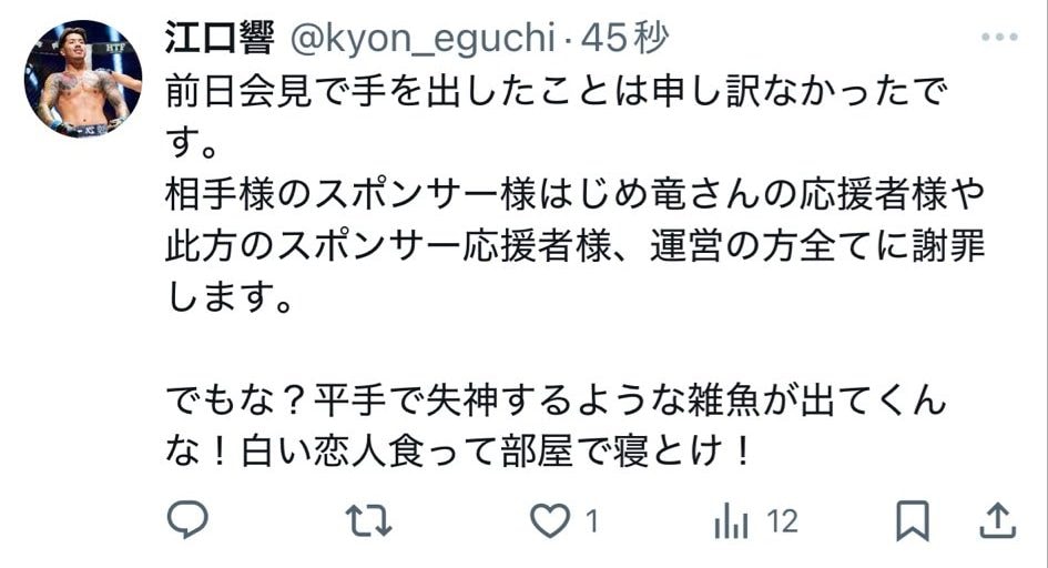 一方、江口は13日の夜にXを更新し「前日会見で手を出したことは申し訳なかったです」と謝罪。しかし、続けて