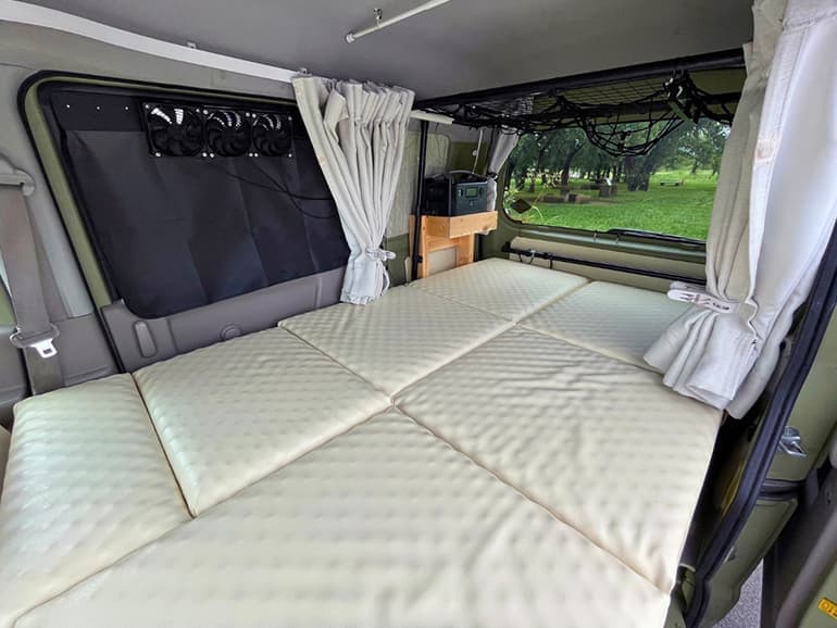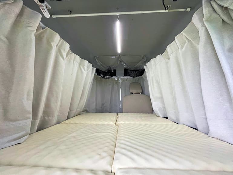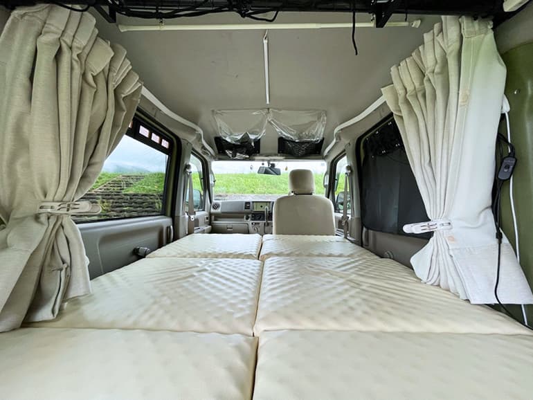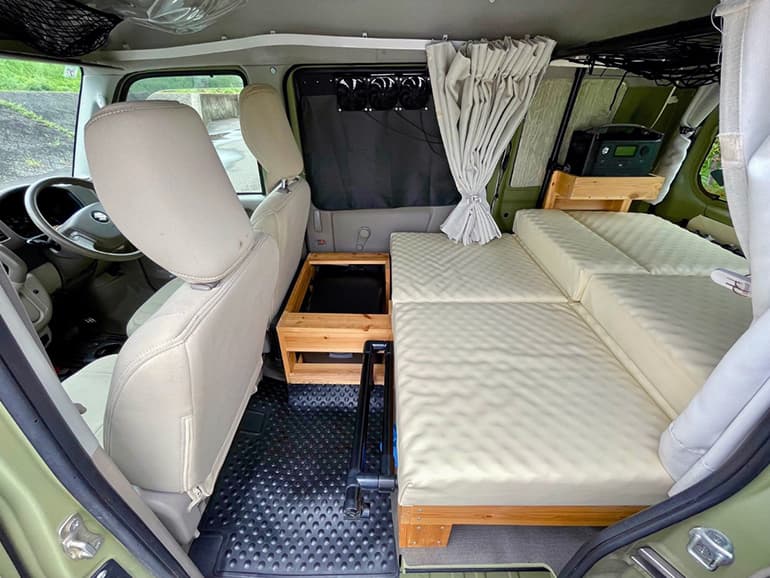 出来上がった車中泊仕様のエブリイは、室内が狭いものの、想像以上に快適な空間。