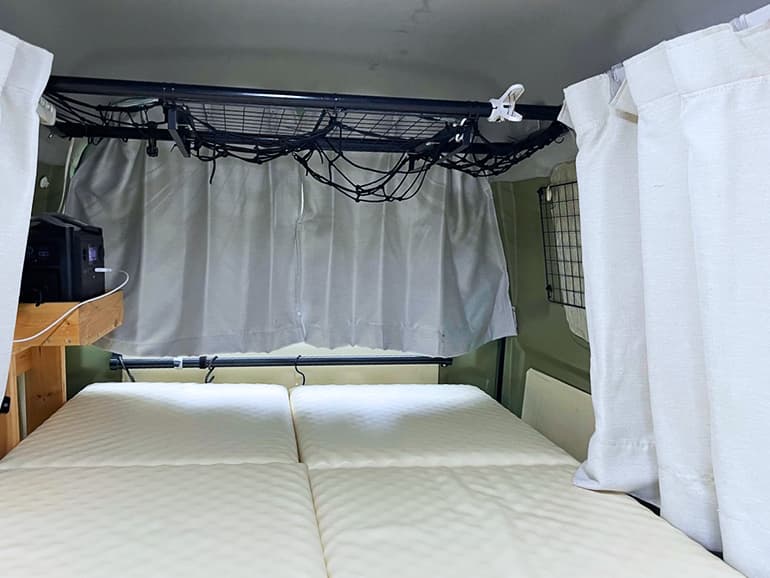 週末車中泊をしていたときはその都度既製品のシェードを窓に貼っていたのですが、長期の車中泊旅で毎日のことになるならできるだけパッと済ませたいと考え、カーテンを設置しました。