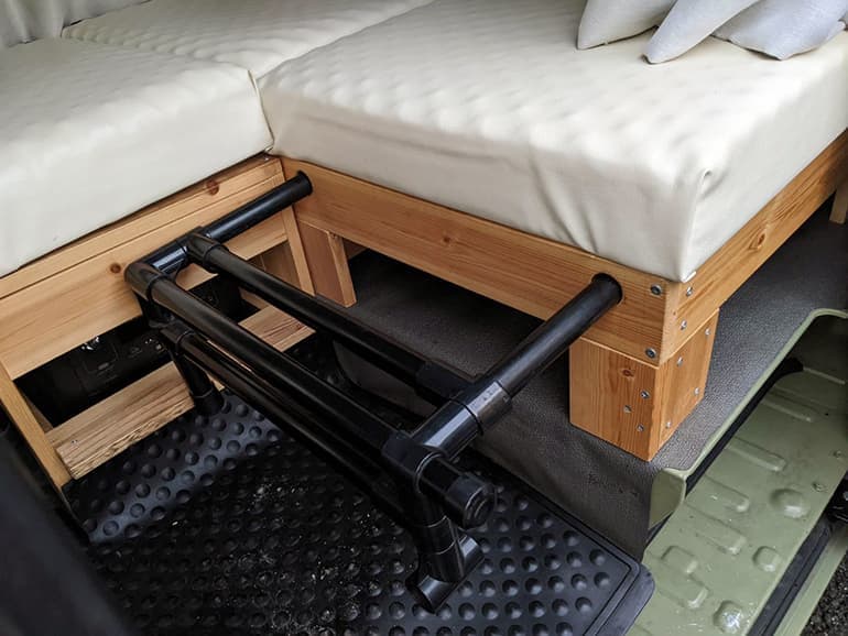 車中泊モードにするときは、手前にある黒いイレクターパイプを引き出しのように手前に引っ張ります。