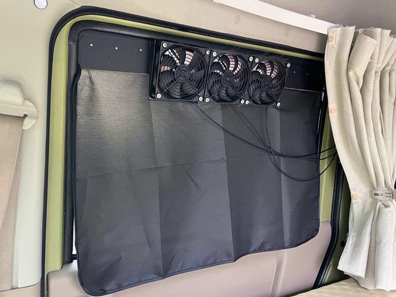 私たちは車内で自炊することを考えていたため、換気ができるように換気扇を作りました。