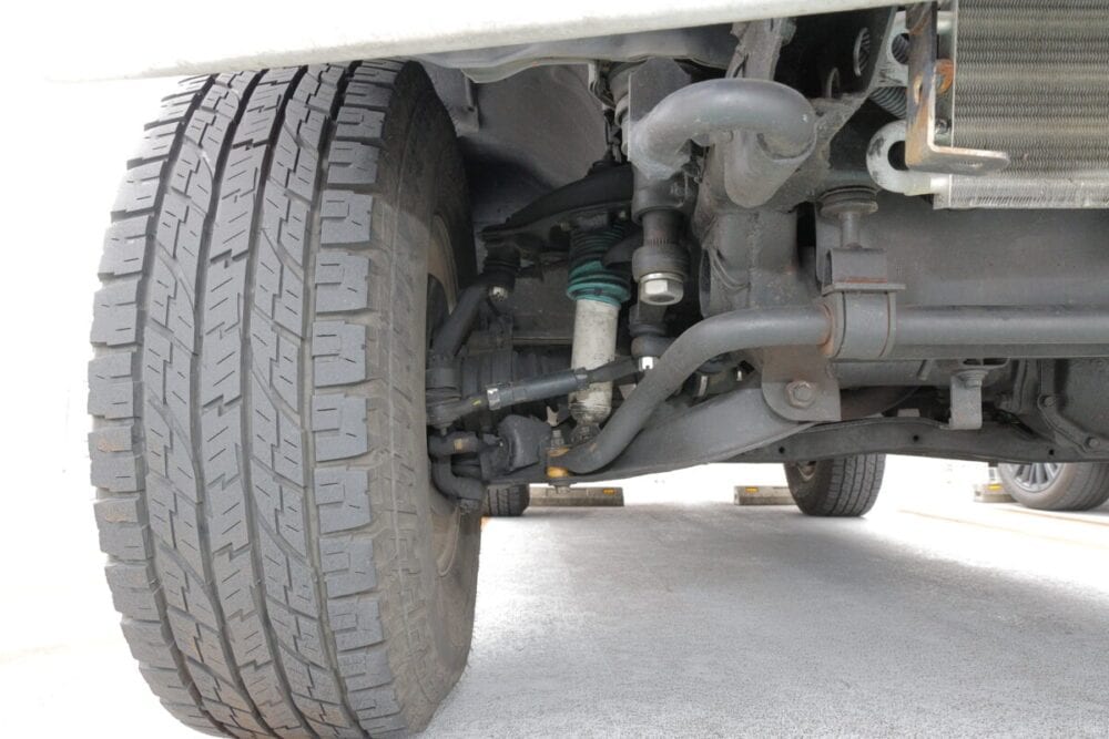 トーションバーとシューエイのスプリングで2インチアップ。フロントアップスペーサーも使用している。