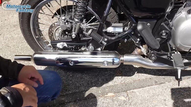 単気筒なのでマフラーは1本のみ。キャブトンフォルムのサイレンサーを採用し、ヒートカバーにもメッキ処理を施して高級感を演出。リズミカルなエンジンの鼓動を体感できる排気音セッティングになっている。