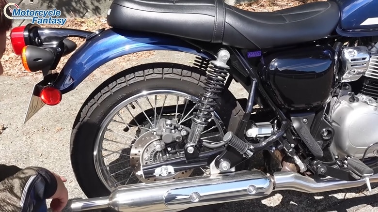 サスペンションはヴィンテージテイストのモデルらしくフロントが正立式テレスコピックタイプ、リアがツインショックタイプをそれぞれ搭載。フロントのフォークブーツはレトロ感を演出するとともに、汚れの付着やサビの発生を防いでくれる。
