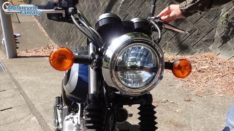 ヘッドライトはクラシカルな丸型デザインだが、中身は上段がロービーム、下段がハイビームの分割式で、光源にはLEDを採用。ウインカー樹脂製ボディでヘッドライトケースのメッキ処理とは対照的だが、大きくて視認性は高い。