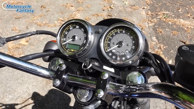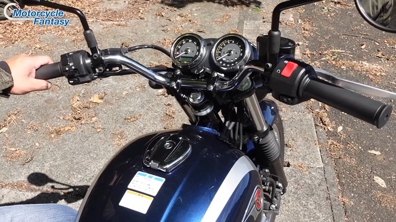 ハンドルは22mmのアップタイプで、232ccエンジンと軽めの車体ということもあり、幅そのものはそれほど広くない。全体のクラシカルな印象に対し、左右スイッチボックス類は現代的なデザインを採用して扱いやすさを追求。メーター周りは左に速度計、右に回転計の2眼タイプで、トリップ&オドメーターはデジタル式。ETC車載器は純正オプションで用意されている。