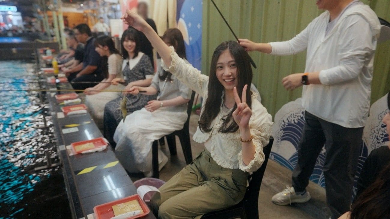 瀬戸口と川端がトップを争う一方で、なかなか釣れない長嶋、増田、愛宕の3人。釣り針に引っ掛けるエサを多めにする「エサ増し増し作戦」を試した長嶋は1匹釣れたものの、生きの良さに驚き、エビを触るのに苦戦。その後、愛宕も1匹を釣り、合計で6匹に。その場で釣ったエビを揚げてもらい、5人は食感を楽しむ。