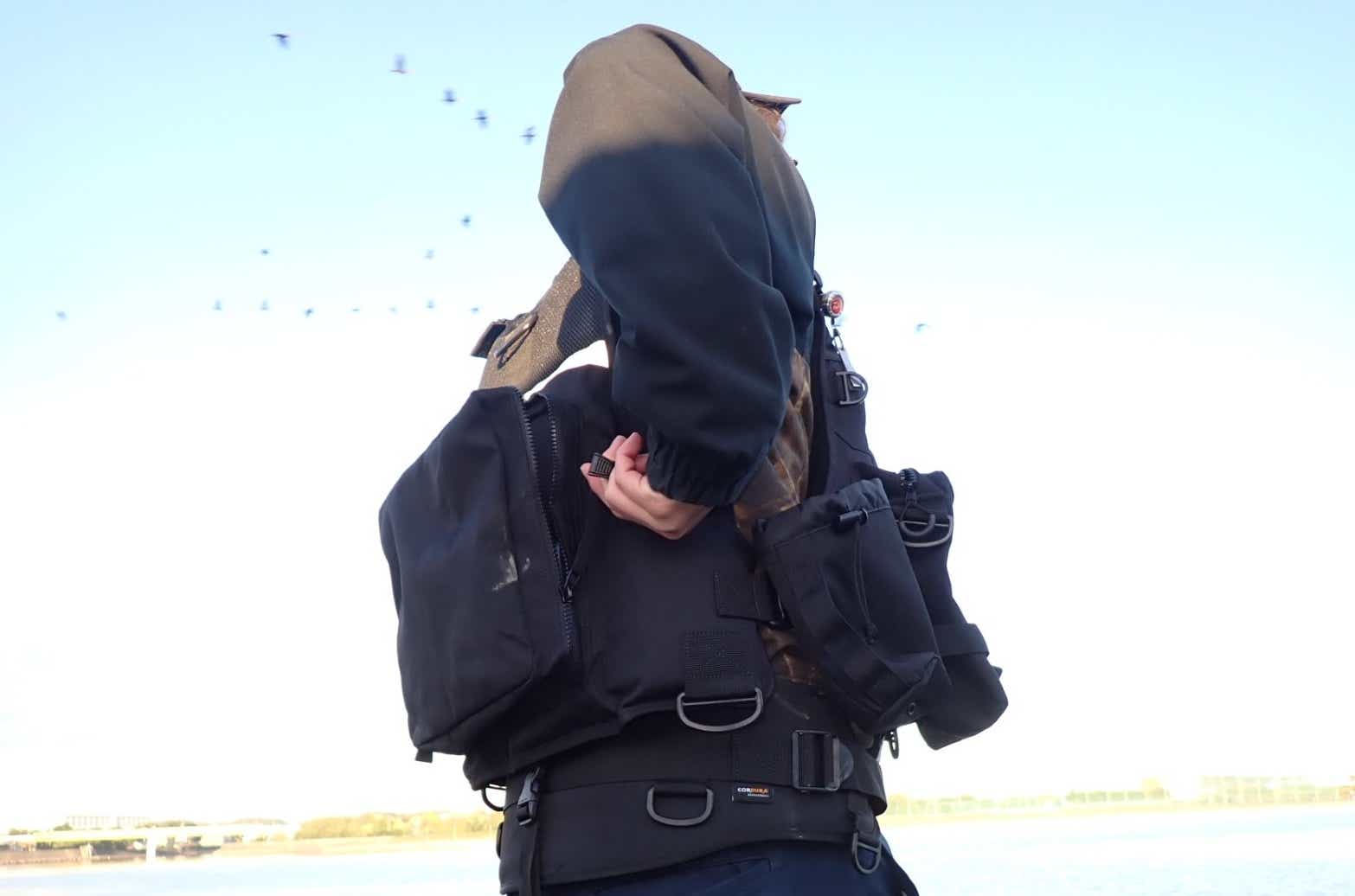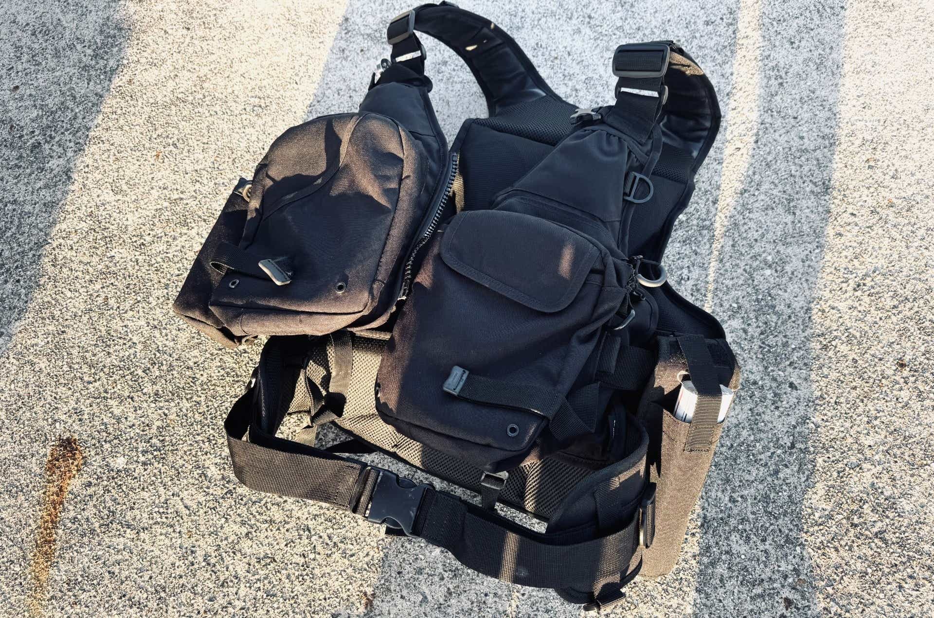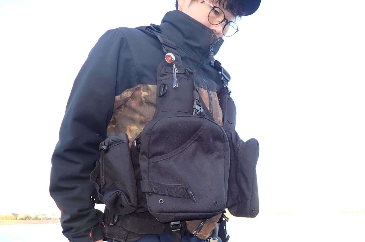 しかし、このライフジャケットは紐が長いおかげで、着ぶくれしていても背面ポケットをスムーズに開閉でき、収納力を余すことなく活用できています。
