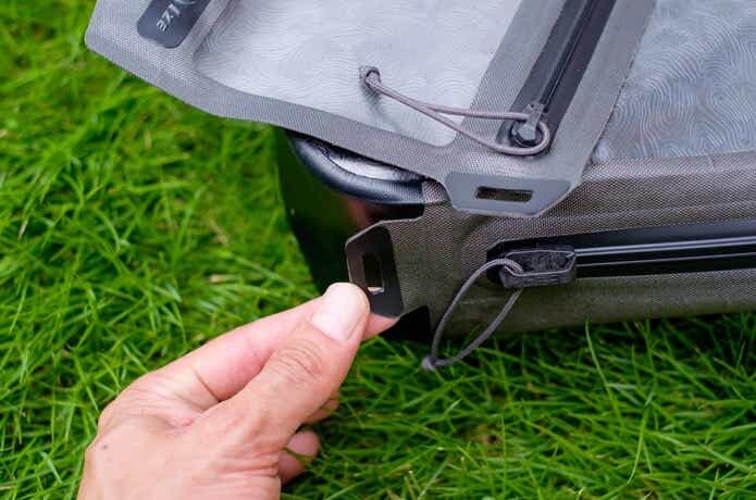 閉めるときは、くるくると巻いてバックルで留めればハンドルにもなるロールトップ式ですが、イエローテープ部分は面ファスナーになっているので、巻かなくても閉じることが可能です。
