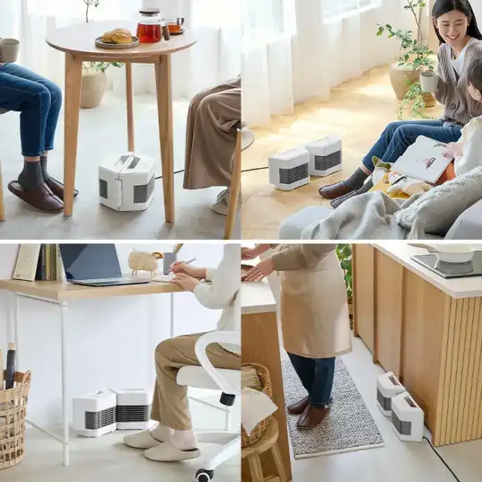 アイリスオーヤマのセラミックヒーターは、使う人数やシーンに合わせて形を変えられるのが特徴。閉じた状態なら正面と背面の両側から暖気を届けられるため、向かい合って座る2人を同時に暖めることができます。開いて角度をつければ、足元を囲うように使えたり、L字配置で広範囲をカバーしたりと、置き方の自由度も高め。片面だけの使用も可能です。