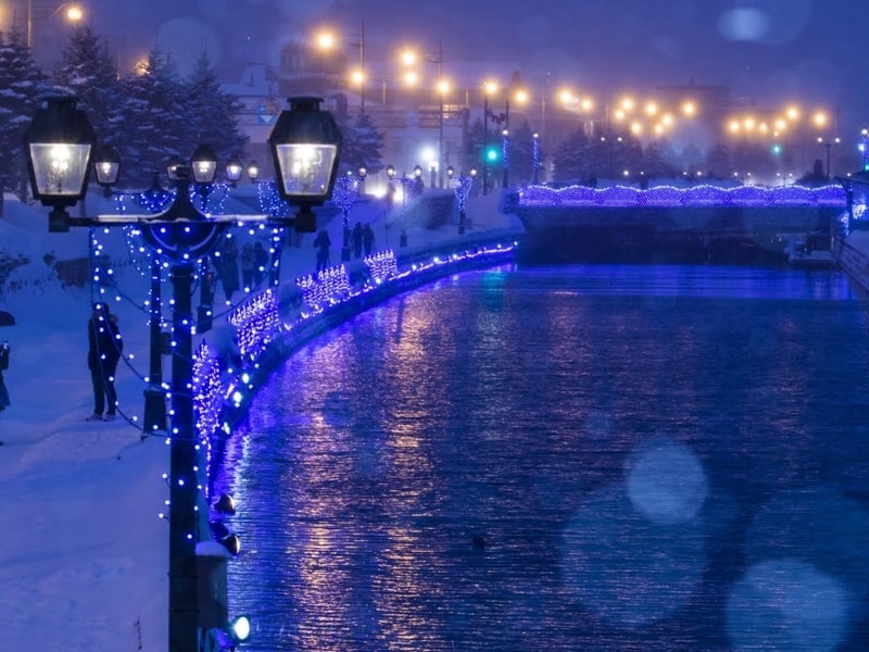 「青の運河」イルミネーションが開催され、雪景色と青い光の競演が楽しめます。