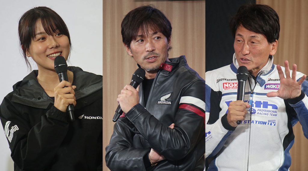 「2026年4月26日(日)に袖ヶ浦フォレストレースウェイ(千葉県袖ケ浦市)で『CBミーティング』が開催されますが、そのなかで行われる『4時間耐久レース』に、なんと私と坂本さんの2人で出場します!もちろんCB1000Fで、です!(驚く坂本氏の顔を見ながら)坂本さんにこのことを話すのは、このトークショーが初めてです。2人でCB1000Fの性能を最大限に引き出したいと思います!」(丸山氏)