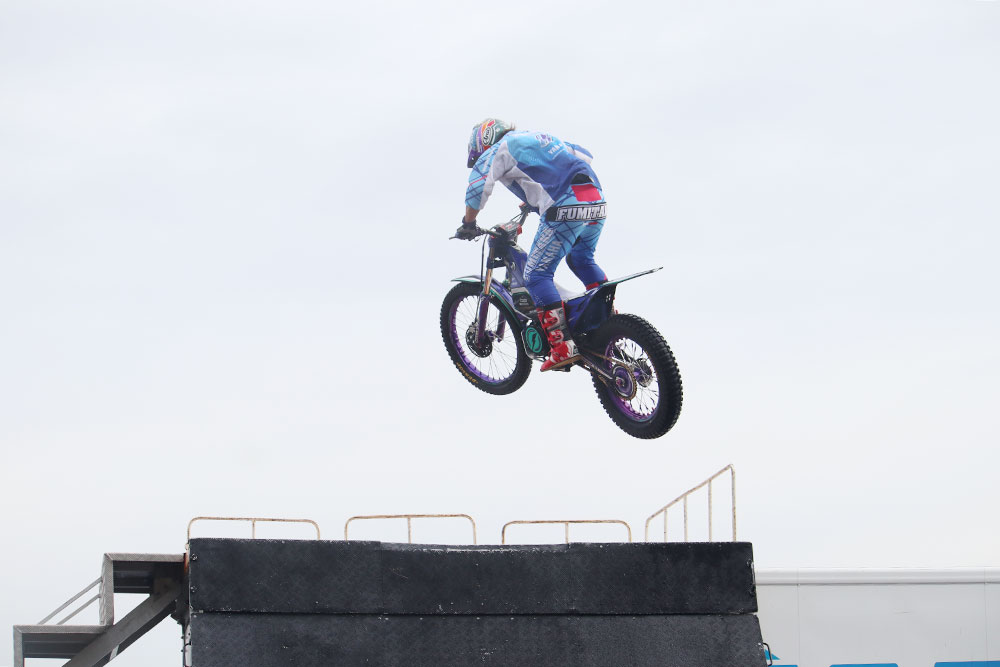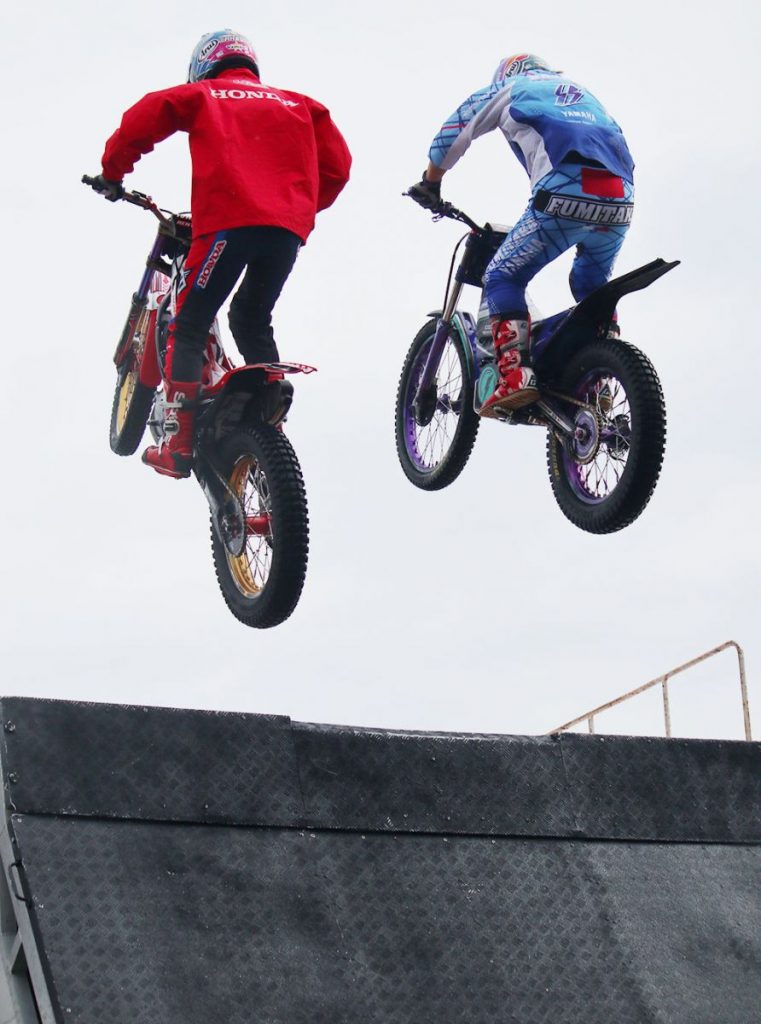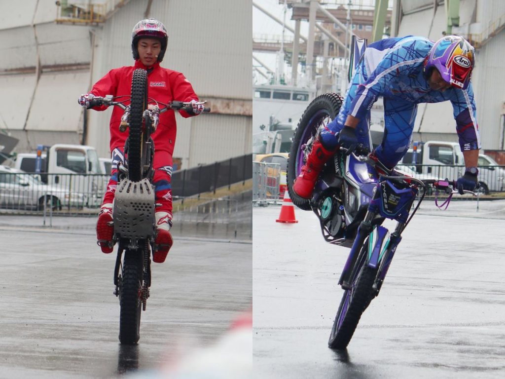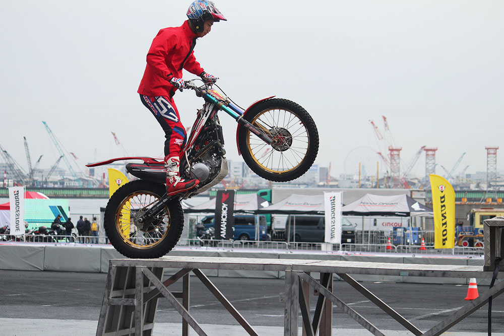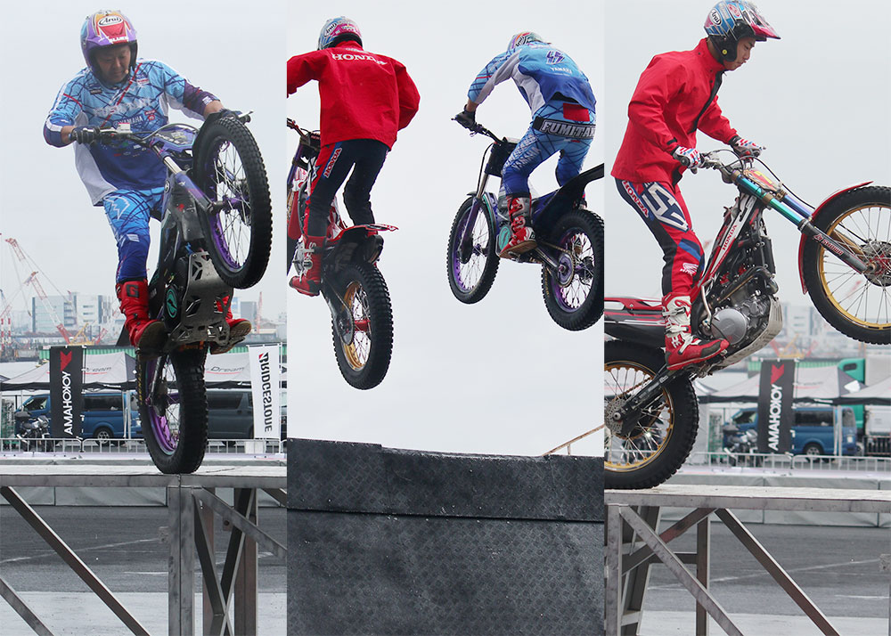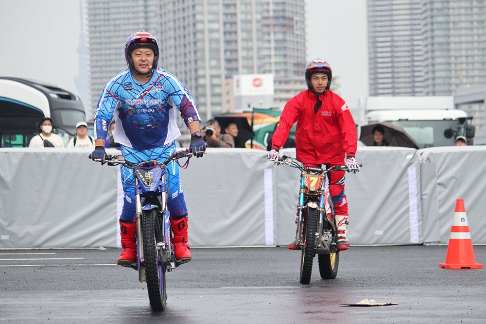 この日の目玉企画の一つが、ホンダとヤマハのトライアルライダーが夢の共演を果たす「Honda × YAMAHA トライアルデモンストレーション」です。国内最高峰の大会「MFJ全日本トライアル選手権シリーズ」で鎬を削る、TEAM MITANI Honda所属の武田 呼人(たけだ・よひと)選手(以下、武田選手)と、Team NOZAKI YAMALUBE YAMAHA所属の野崎 史高(のざき・ふみたか)選手(以下、野崎選手)が、プロのテクニックを惜しみなく披露してくれました。
