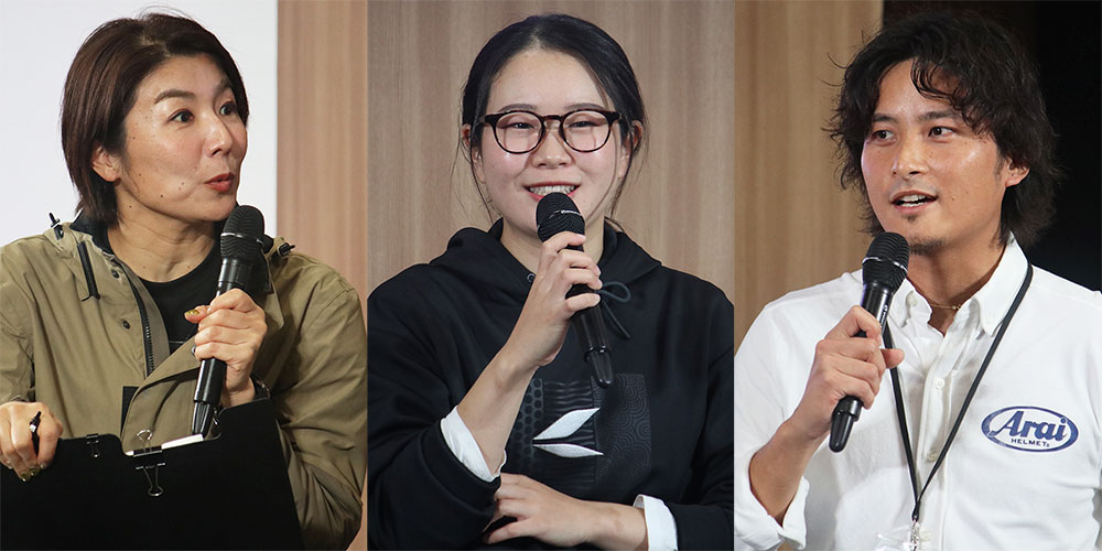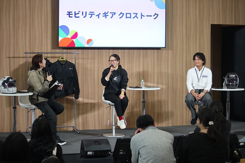バイクライフを安全に楽しむためには、ヘルメットやライディングウェア、プロテクターなどの適切なギア選びが不可欠です。「モビリティギアクロストーク」では、バイク用品を選ぶ際に役立つ知識や情報を、専門家の方々が解説してくれました。フリーアナウンサーの柴田 直美さん(以下、柴田さん)がMCを務め、株式会社アライヘルメットの相神 隼平氏(以下、相神氏)と、株式会社アールエスタイチの篠田 帆乃香氏(以下、篠田氏)が登壇し、日頃のバイクの楽しみ方や、そこから得た経験と知識を語っていただきました。
