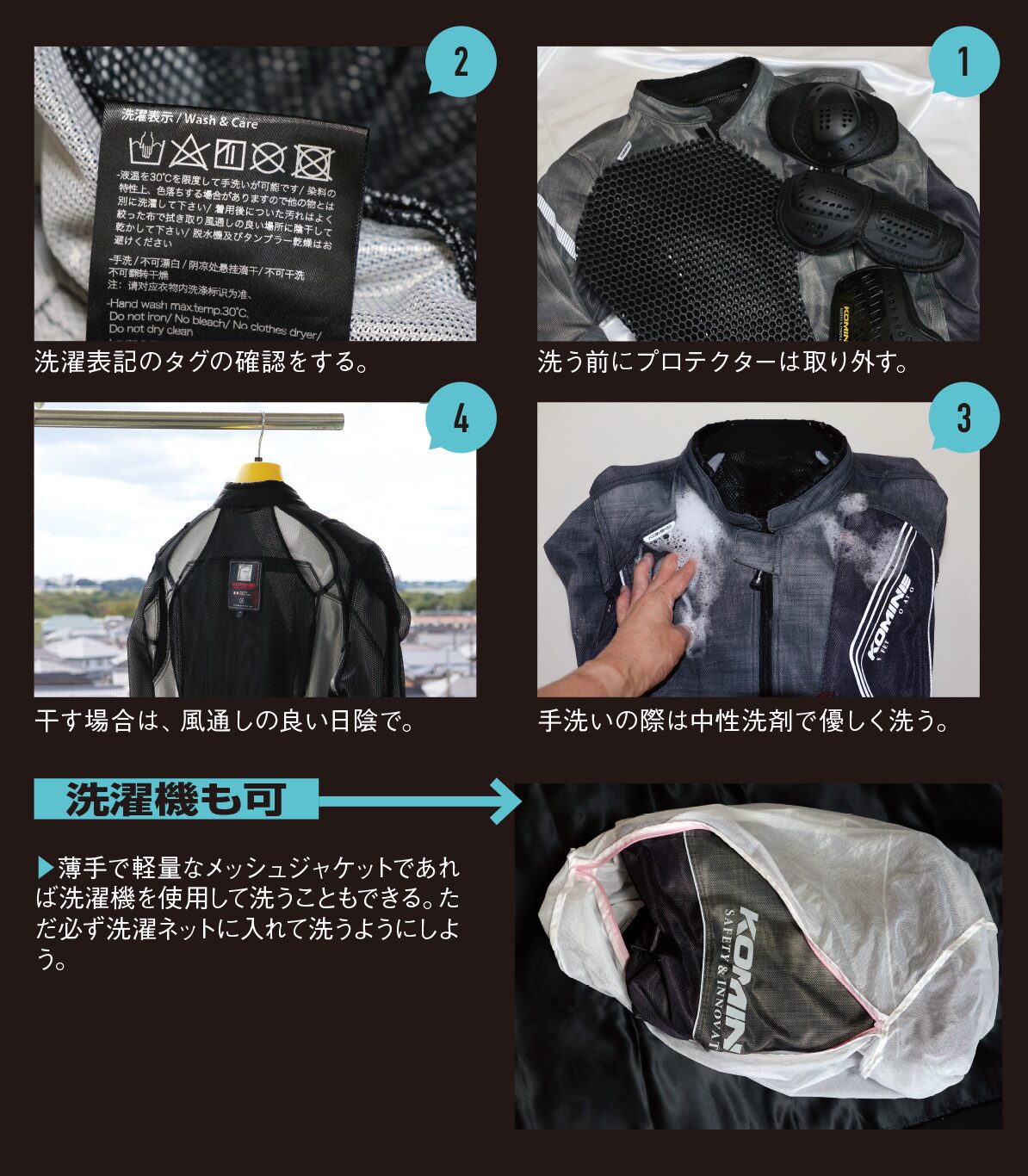 ここではジャケットの手入れ方法を解説しよう。まずは砂やホコリ、虫などを柔らかいブラシで払い落とし、汗や皮脂汚れは中性洗剤を使い、ぬるま湯で優しく手洗いする。洗濯機を使う場合はプロテクターを外し、洗濯ネットに入れて弱水流で短時間にしておこう。漂白剤や柔軟剤は生地を傷めるため避けること。脱水は軽く行い、形を整えて日陰の風通しのよい場所で自然乾燥させる。乾燥後は撥水スプレーを軽く吹き付けると防風・防汚効果が復活し、ジャケットを長持ちさせられる。