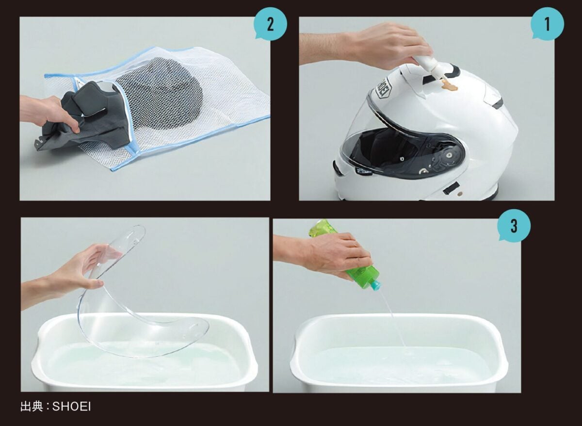 ヘルメットは外装をクリーナーでやさしく拭き、内装は専用洗剤や中性洗剤で手洗いもしくは洗濯ネットに入れて洗濯し乾燥させる。シールドは細かい傷を防ぐため強くこすらず、水で汚れを落とすのが基本。