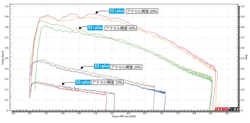 アクセル開度10%/20%/40%/60%という低中速域で、それぞれ明確なパワーUPが確認されている。