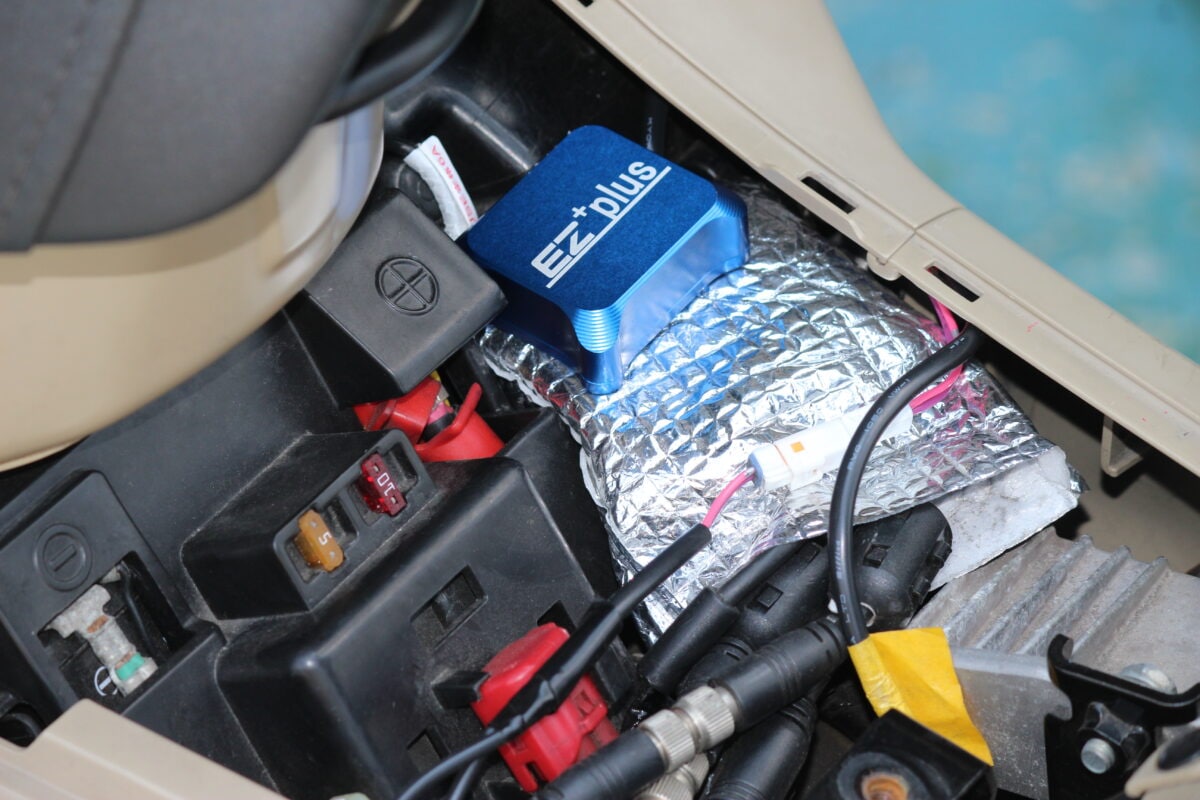 このEZ+plusは、車体のO2センサー(酸素濃度センサー)に本体を接続することで電気的な信号を送り、燃料を適正に補正してパワーとトルクを上げるチューニングパーツである。