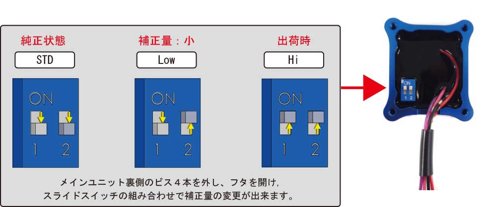 しかし、メインユニット裏側のビス4本を外してフタを開けると、スライドスイッチが現れる。このスイッチの組み合わせで、燃料補正最大の「Hi」、燃料補正量の少ない「Low」、純正状態の「STD」に変更できるので、この操作でセッティングを煮詰めることができるわけだ。