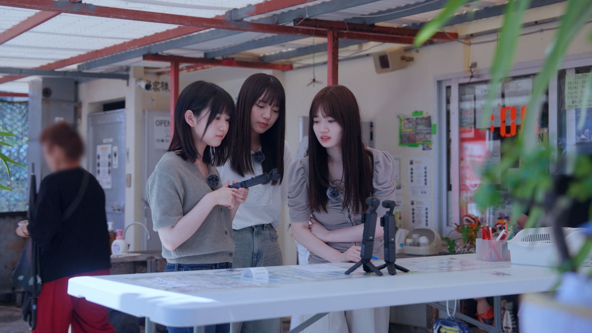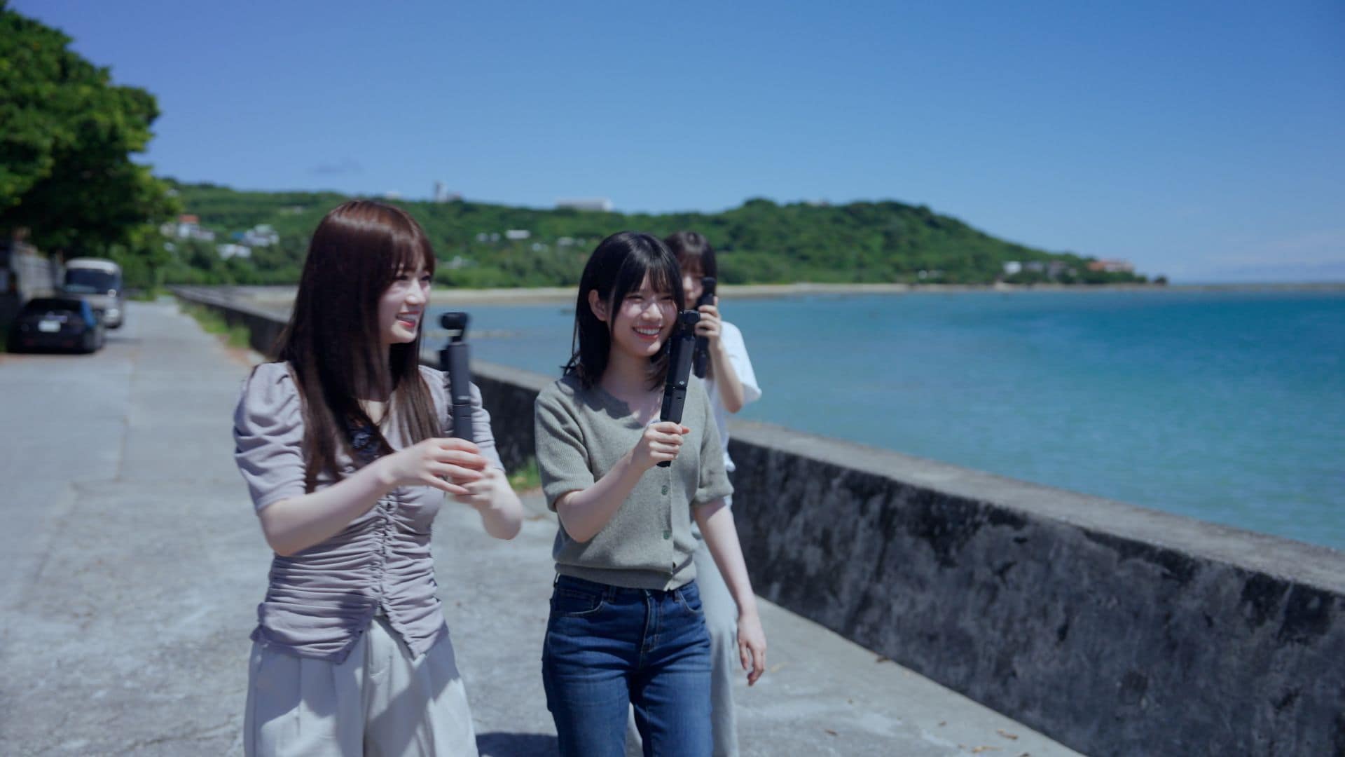 正午。昼ごはんを探しながら海辺を散策する愛宕心響、海邉朱莉、増田三莉音。3人は橋の上から臨む青い海に感激し、海の中に生息するイカを見て大興奮。イカを見ながら「浜行ったら捕まえられる」と言う海邉。増田は「あれ絶対クラゲやって!」と海の中を指さす。そんな増田に、愛宕は「イカやって」とツッコむ。