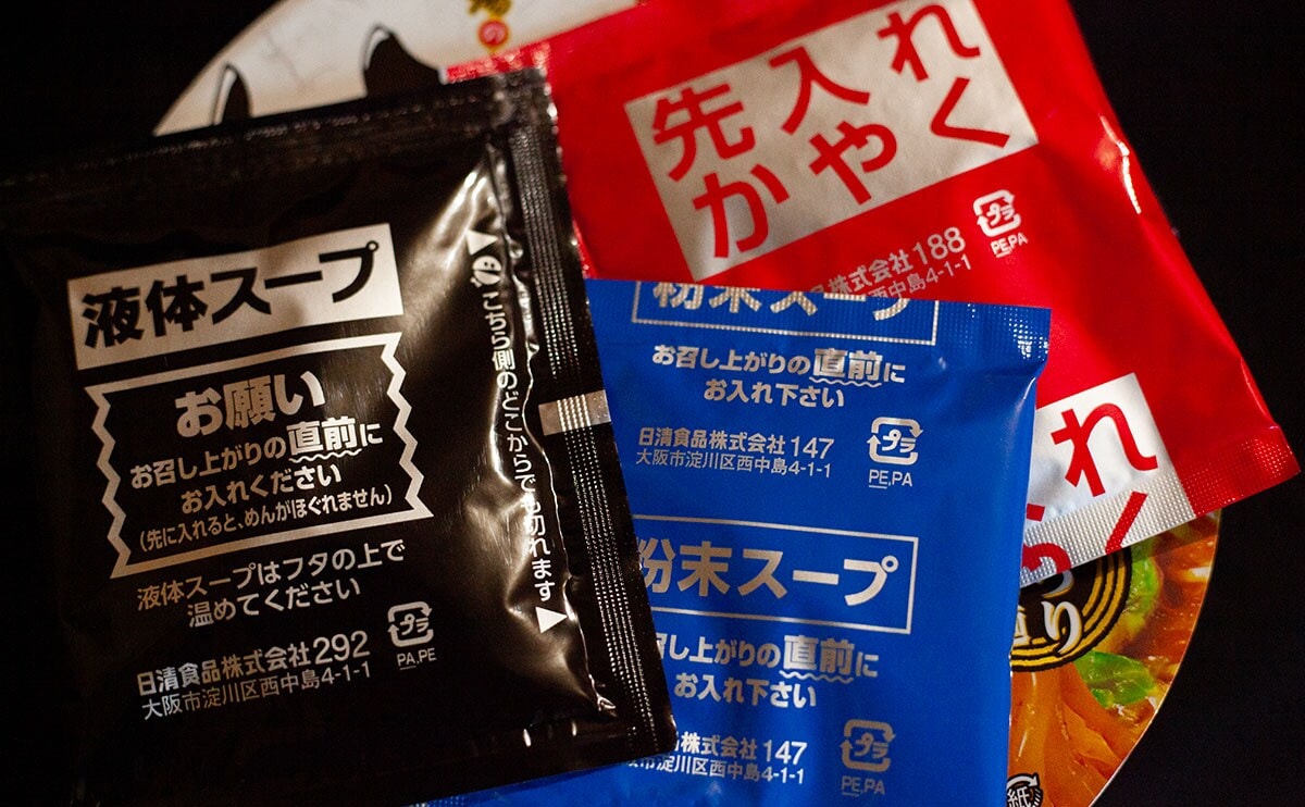 フタを開けたら、3つの小袋が出てきました。先入れはかやくのみ。あとの2つは、後入れです。粉末スープも後入れなので、ご注意くださいね。