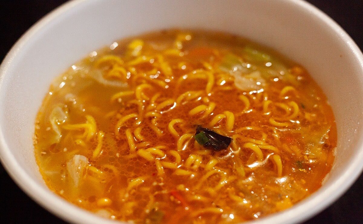 お湯を注ぎ、待つこと5分。粉末&液体スープを加えてよく混ぜたら完成です。ちなみに、後入れの粉末スープってダマになりやすいイメージがあったのですが、比較的溶けやすい気がしました!なんとなくですが!!