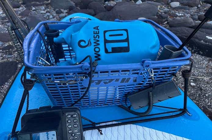 水抜けが良く、ロッドスタンドを付けたり、カラビナを付けたり、魚探の振動子を付けたりとDIYでの拡張性があり、SUPフィッシングの艤装品としては欠かせません。