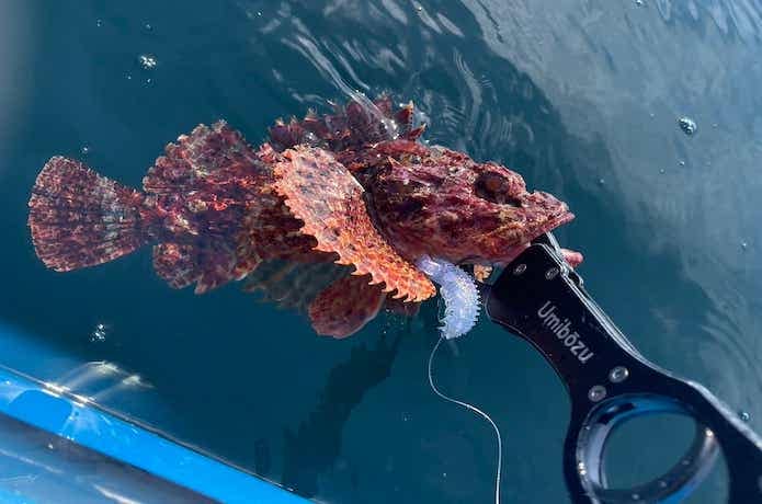 SUPフィッシングでは大型の魚や歯の鋭い魚、毒魚がかかることも多いのでフィッシュグリップは必ず携帯しましょう。