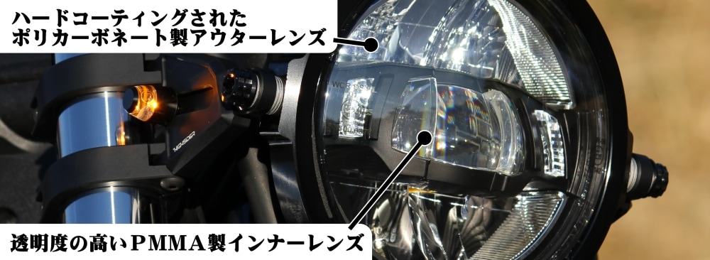 内側には、透明度の高いPMMA(アクリル)製インナーレンズを使用しています。LEDの光をそのまま通すのではなく、屈折や拡散をコントロールする設計で、照射方向や輪郭を精密に整えます。強度はポリカーボネートに劣りますが、インナーは外部からの衝撃を受けにくいため、光学性能を優先した素材選定となっています。