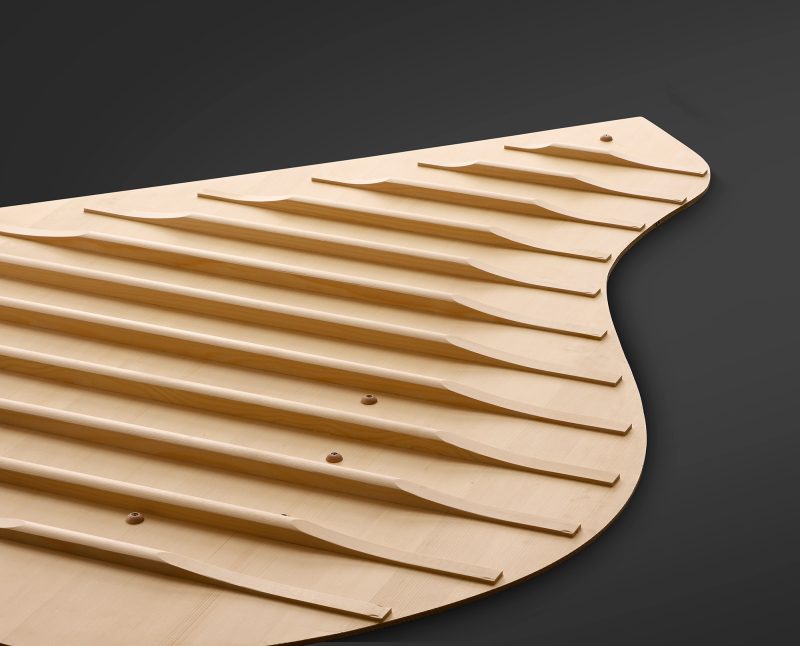 弦の振動を増幅させ空間全体に美しく響かせる役割を果たし、ピアノの心臓部ともいわれる響板に、厳選したヨーロッパスプルースのみを使用。「CFX」同様の新たな湾曲構造を踏襲し、軽さと強さを両立した振動効率の高い響板に仕上げた。「表情豊かな演奏」を追求して細かな調整や最適化を行い、奏者を包み込む立体的な響きを作り出す。