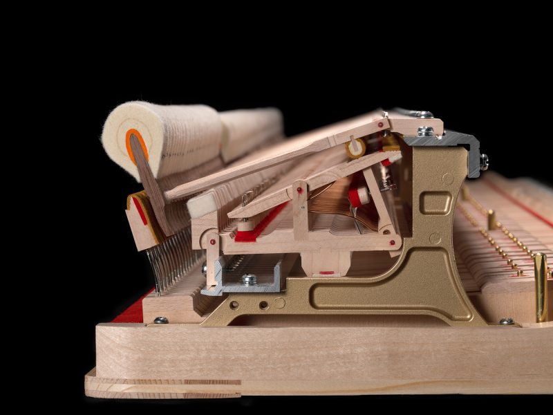 ピアニストの打鍵を正確に弦に伝えるアクションは自社開発。「CFX」の開発で培ったノウハウを生かし、打鍵された力が漏れなく伝わるよう各パーツの接点部を最適化した。新形状の部品を採用し、初動の摩擦を低減するなど随所に新技術を投入。特に弱く打鍵した際、指に吸い付くような滑らかなタッチを実現し、微細なニュアンス変化をコントロールできるようになった。