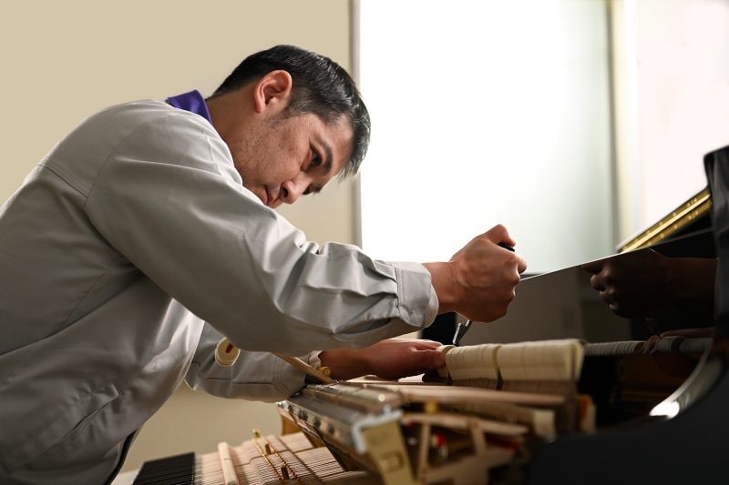 専用に開発した弾力性に優れたハンマーの魅力を最大限引き出すために、職人が多くの時間をかけて、ピアノ本体や細かな部品一つ一つの状態に応じて音作りやアクション機構を精密に調整。低音から高音までバランス良く多彩に変化する音色や、繊細なタッチ感の細部まで手作業で整えている。