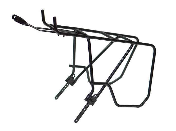 これにより、バッグとペダリング時のかかととのクリアランスが大幅に確保され、大容量のパニアバッグを装着しても、ストレスなくペダリングが可能です。さらに、サイドフレームが後端下側まで広げられているため、走行中にバッグがホイールに接触するのを回避します。