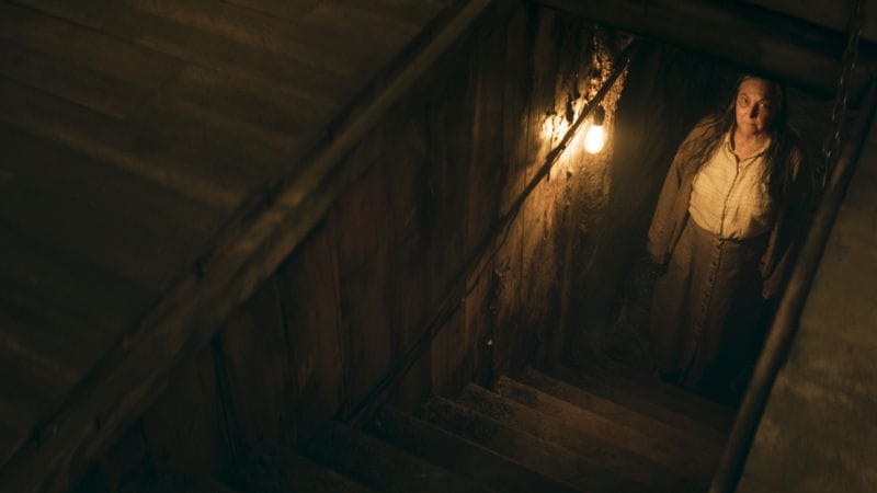 息を飲むほどの静寂に包まれた深い森の中、ふいに現れた犬に導かれるように進んでいき、ある一軒家の前にたどり着いたミア。「ご用かしら?」と、突如として声が聞こえ、驚いて懐中電灯をかざすと、そこにはまぶしそうに手をかざす老婆の姿が。ミアが「住民がいると思わなくて」と伝えると、老婆はしゃがれた声で「ずっと住んでいるわ」と返事をする。