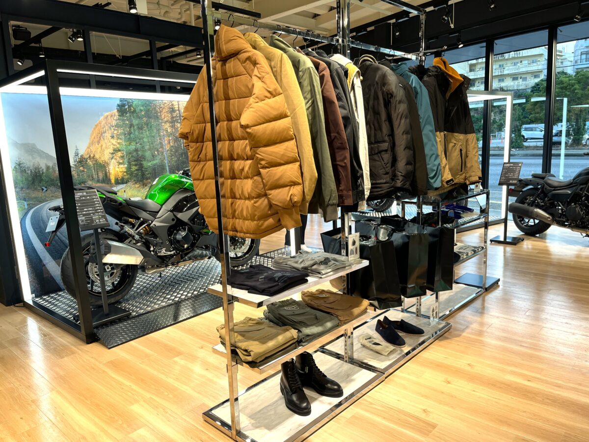 木目調のフロアと白い天井が織りなす明るい店内。モーターサイクルとプラザアパレルがゆったりと展示され、どなたでも楽しめる空間となっています。