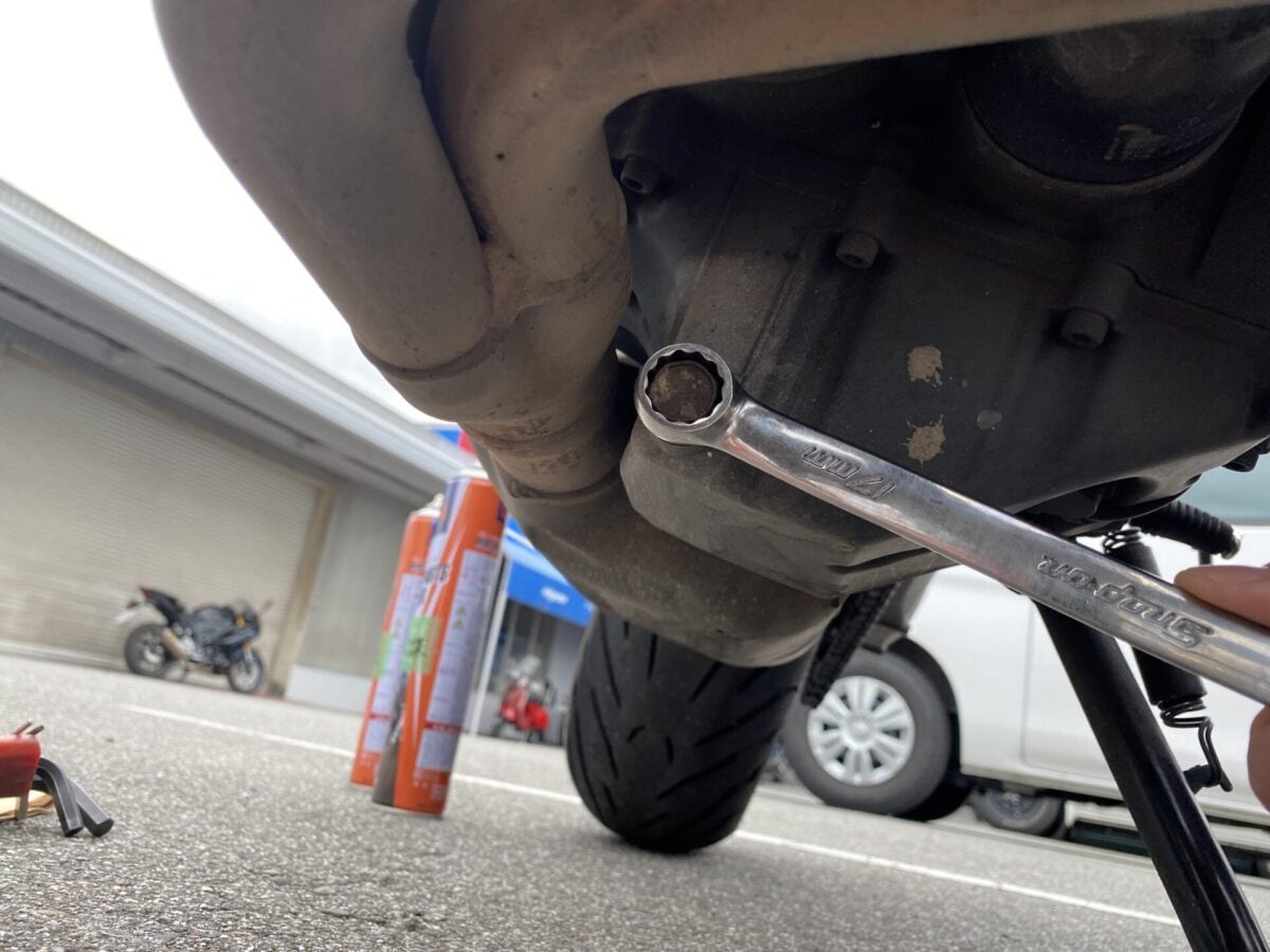 フィラーキャップを取り外し、いよいよドレンボルトを外します。