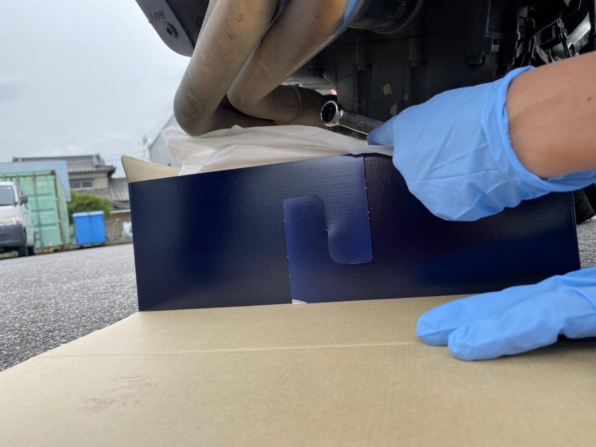 廃オイルを処理できるようにオイルチェンジキットの外箱を使ってオイルトレーとしてセット!