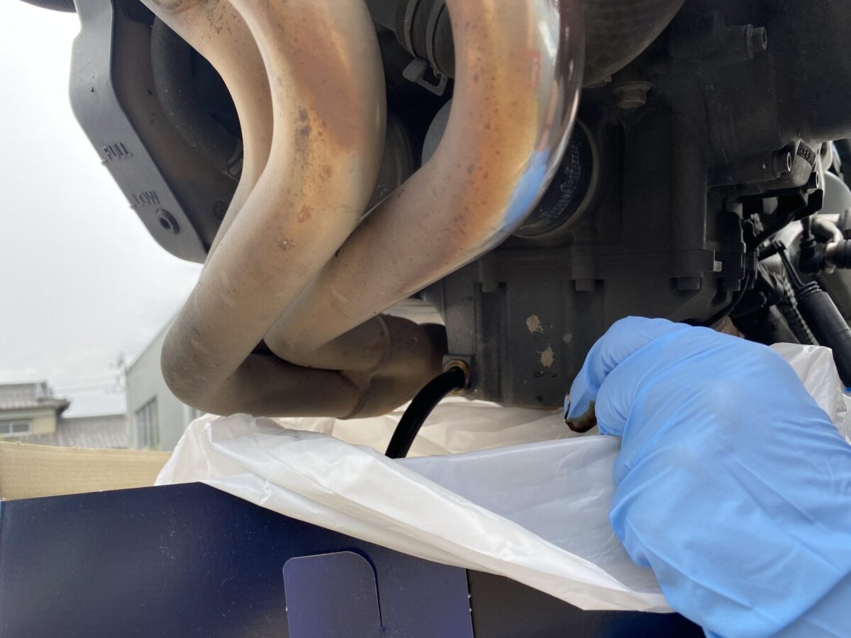まあまあな勢いでオイルが出てきます。この時、廃オイル受けが若干ずれており後々惨事になったのは内緒です。みなさんは気を付けてくださいね。(笑)