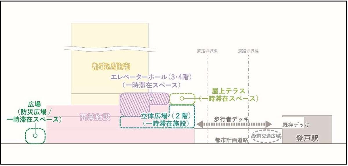 また、事業計画書では、防災広場や防災備蓄倉庫、自家発電設備などを整備し、地域の防災活動拠点としての役割も持たせる方針が示されています。災害時には帰宅困難者らの一時的な滞在スペースとしての活用も想定されていて、居住者や施設利用者だけでなく、地域住民や来訪者の安全・安心に寄与することを目指しています。