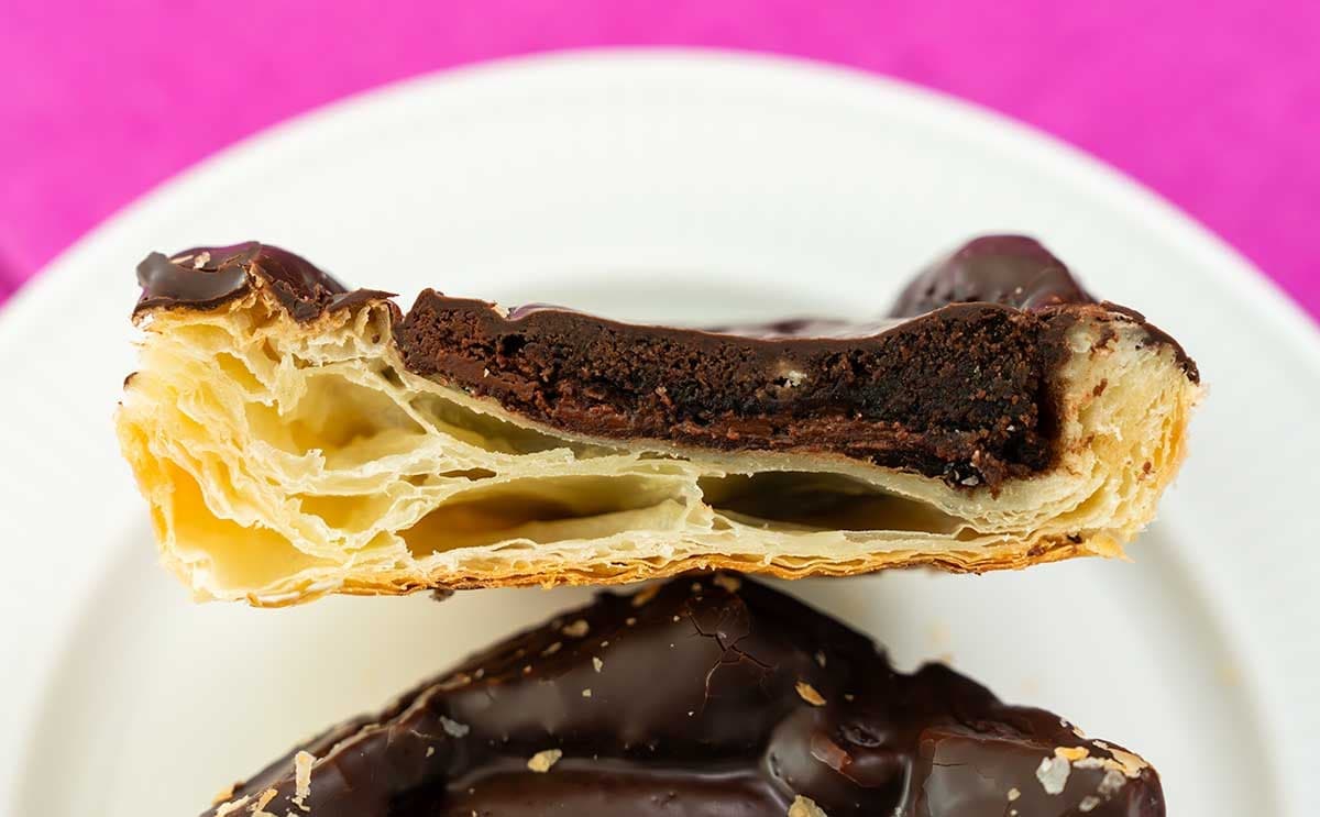 半分にカットし断面をチェックすると、パイ生地とチョコのコーティングのあいだに、ブラウニーが入っていました。